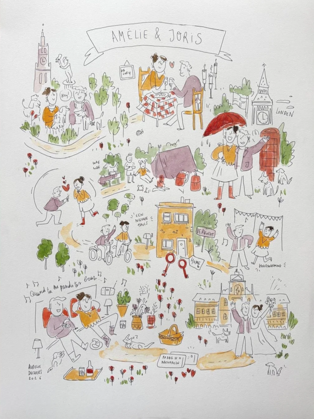 Alle details zijn welkom: eerste dates, onvergetelijke reizen, favoriete plekjes, tradities, hobby’s… Hoe meer ik weet, hoe persoonlijker de illustratie wordt.